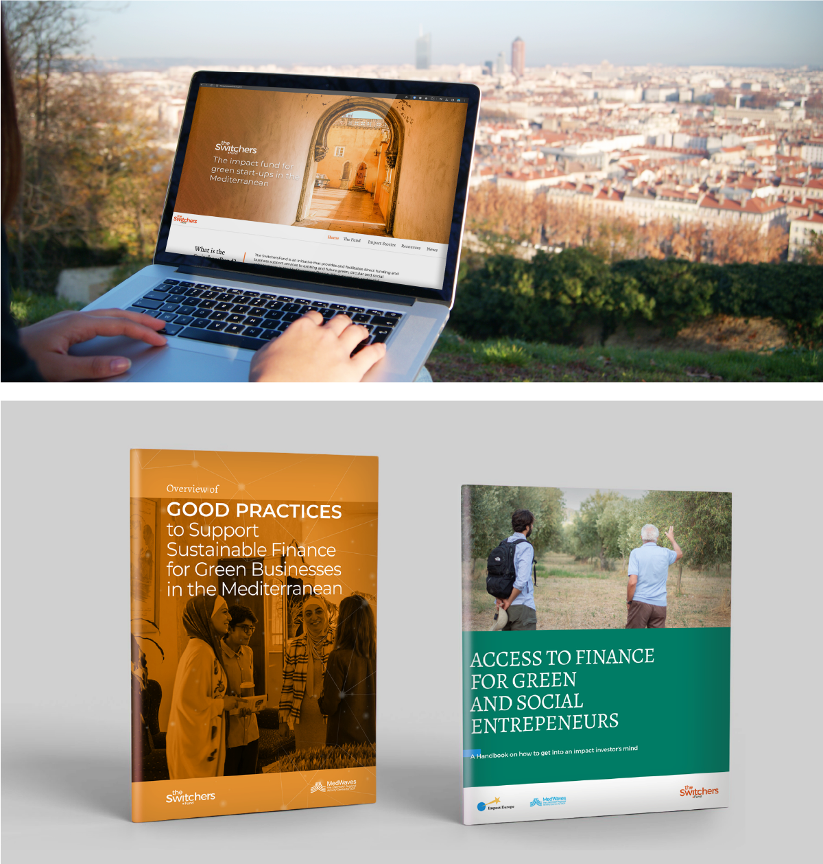 Por otra parte, el otro requerimiento fue la creación de diseño editorial para dos productos: un report llamado “Panorama de buenas prácticas para apoyar la financiación sostenible de empresas verdes en el Mediterráneo” y una guía llamada “Acceso a la financiación para emprendedores sociales de origen verde”, ambos con funcionalidades y públicos muy diferentes. Esto tuvo con resultado dos formatos distintos de presentación, con una gráfica y una diagramación acordes a sus objetivos.